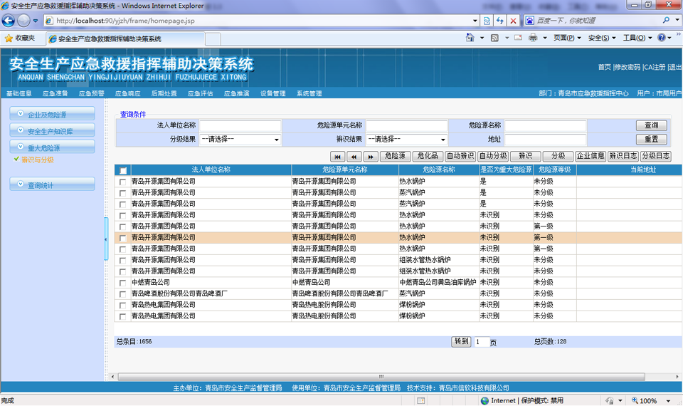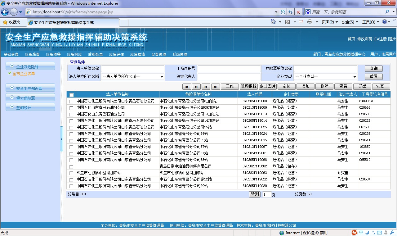 ? 對存在危險源的企業(yè)進(jìn)行管理和查詢,可以按地區(qū)、經(jīng)濟(jì)類型、所屬行業(yè)等支持多種查詢條件進(jìn)行綜合查詢,查詢結(jié)果提供企業(yè)和所屬危險源的具體信息、以樹形結(jié)構(gòu)展示單位基本情況、及其附屬的安全評價、行政許可等分類信息,方便政府主管部門查看危險源企業(yè)的各種動態(tài)情況??梢栽诰€查詢調(diào)閱危險源視頻監(jiān)控信息、三維模型信息、GIS詳細(xì)信息,企業(yè)及危險源信息可以導(dǎo)出到excel或者word中。