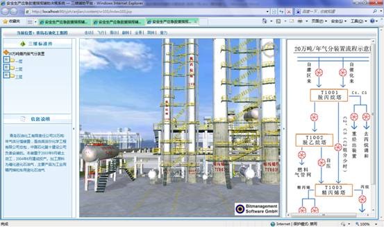 系統(tǒng)集成三維模型子系統(tǒng),根據(jù)企業(yè)名稱或者關(guān)鍵設(shè)備智能關(guān)聯(lián)到三維模型頁面。如下圖所示,左側(cè)菜單顯示當(dāng)前企業(yè)所有的三維模型標(biāo)準(zhǔn)件,右側(cè)顯示裝置生產(chǎn)流程示意圖,點(diǎn)擊菜單或者流程圖節(jié)點(diǎn)皆可直接切換到相關(guān)視點(diǎn)。