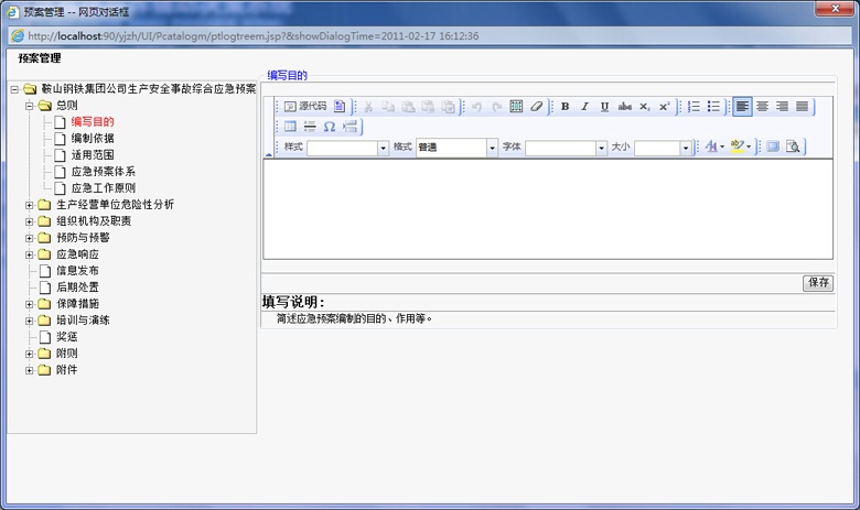 應(yīng)急預(yù)案有綜合應(yīng)急預(yù)案、專項(xiàng)應(yīng)急預(yù)案、現(xiàn)場處置方案構(gòu)成,由于綜合預(yù)案、專項(xiàng)預(yù)案、現(xiàn)場處置預(yù)案的目錄和編制內(nèi)容并不相同,在編制預(yù)案時,編制人員可隨時讀取預(yù)案模板或案例進(jìn)行參考,系統(tǒng)并可提示幫助信息,輔助完成預(yù)案的編制、修訂。