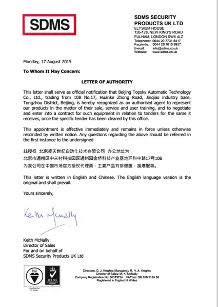 2015年8月17日,北京凌天成為英國SDMS公司排爆服,搜爆服一級代理