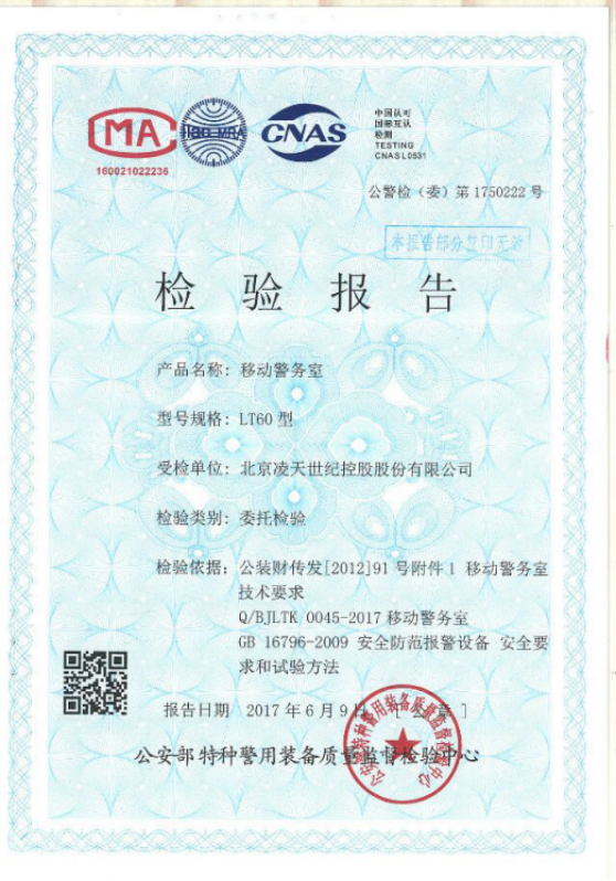我司的移動警務(wù)室取得了公安部特種警用裝備質(zhì)量監(jiān)督檢驗(yàn)中心的檢驗(yàn)報(bào)告。