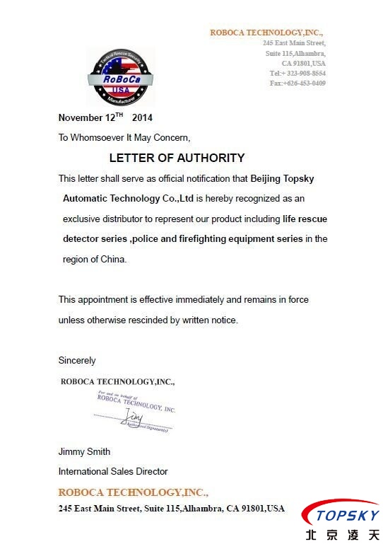 北京凌天成為美國(guó)ROBOCA公司在亞太區(qū)的總代理, 美國(guó)ROBOCA公司是反恐,救援裝備的制造商,主要產(chǎn)品包括氣動(dòng)支撐系統(tǒng),雷達(dá)生命探測(cè)儀,排爆機(jī)器人等.