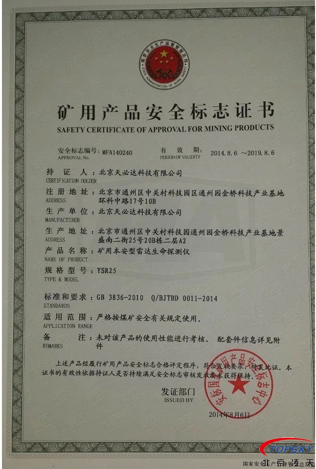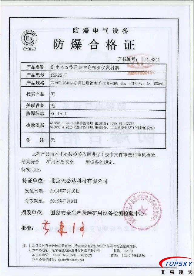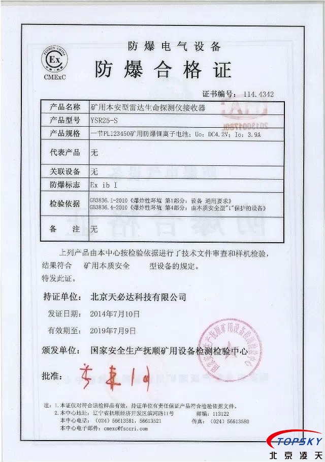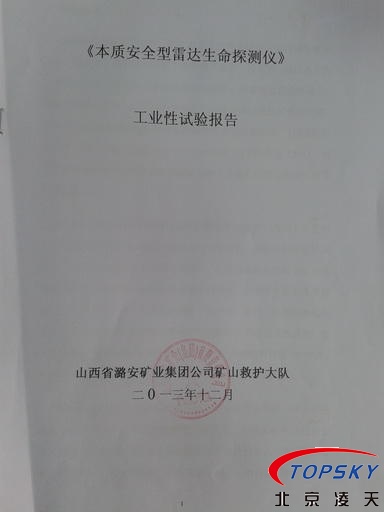 從國家安標(biāo)中心獲悉,YSR25本安型雷達(dá)生命探測儀取得煤安標(biāo)志認(rèn)證(證書見下圖),自此,國內(nèi)本安型可用于爆炸性環(huán)境的探人雷達(dá)取得完整下井資質(zhì),從研制方獲悉,該設(shè)備已在山西陽泉煤業(yè)集團(tuán)救護(hù)大隊(duì)、山西潞安集團(tuán)救護(hù)大隊(duì)、開灤集團(tuán)救護(hù)大隊(duì)進(jìn)行過工業(yè)性試驗(yàn),試驗(yàn)效果良好,探測距離達(dá)到25米(報(bào)告見下圖)!